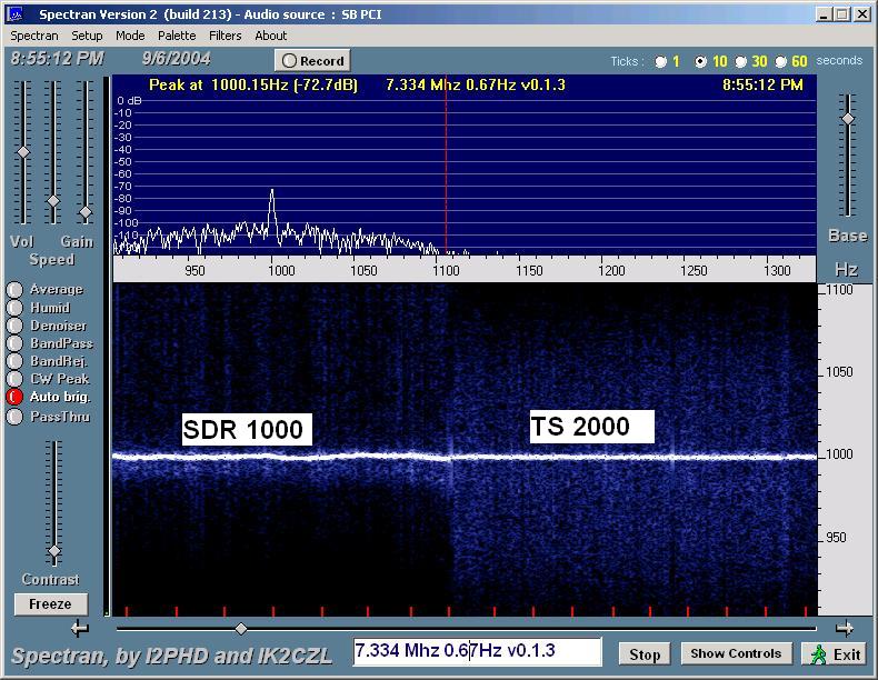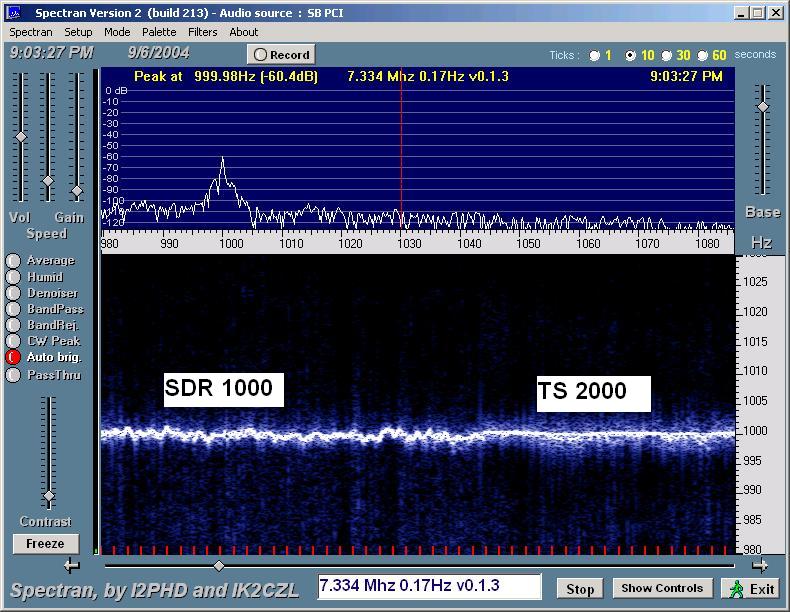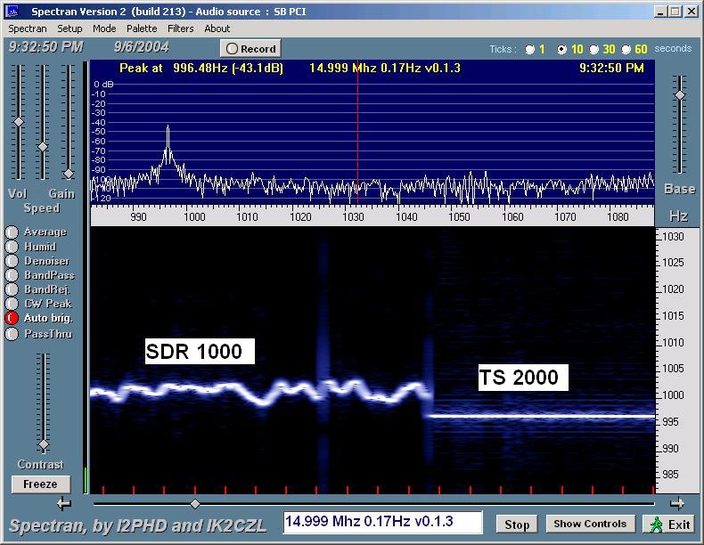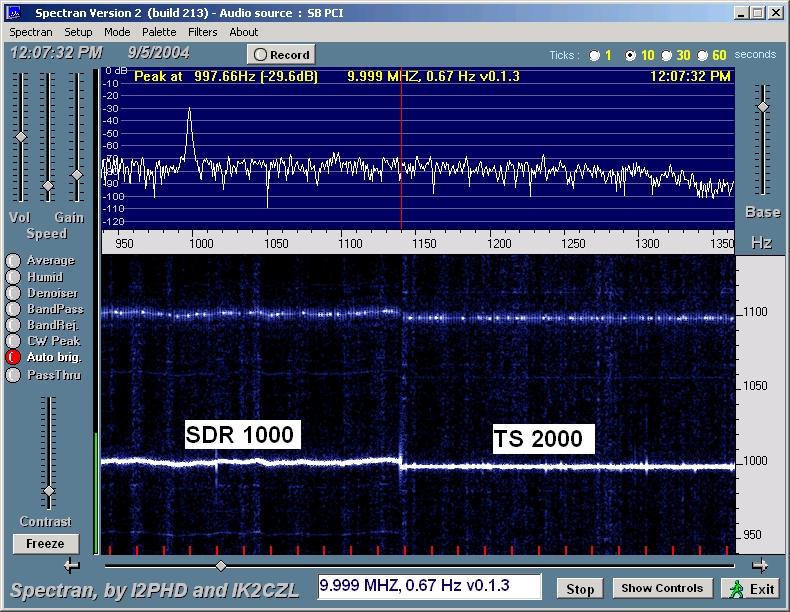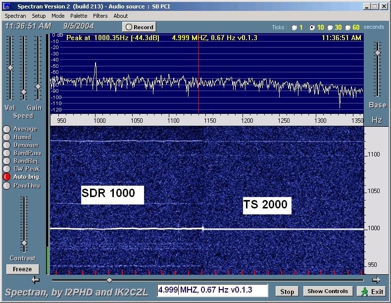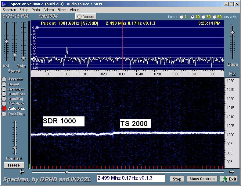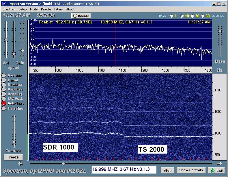 WWV at 20 MHz (shown above) was considerably weaker, definitely not audible. Spectran was able to dig it out with both the SDR-1000 and the TS 2000. Again we see a bit of a waver. I'm not sure what causes the other harmonic traces showing for both radios. It's hard to tell with how weak the trace is, but the frequency wobble seems a little larger than at 15 Mhz.