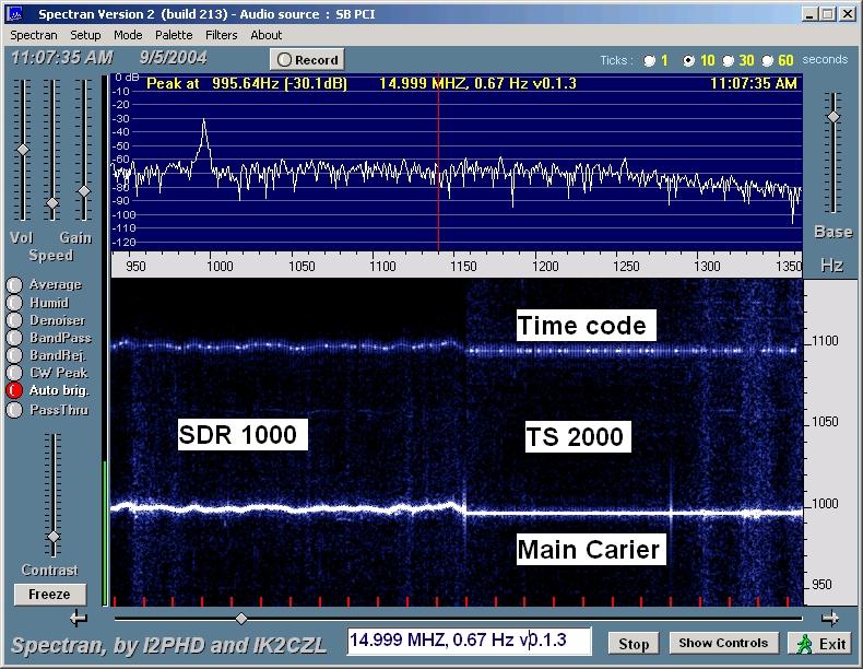 Above shows a Spectran trace of WWV at 15 MHz. A 3-4 Hz wobble is clearly seen in the SDR trace. The bold trace is the main WWV carrier and the lighter trace is the encoded time code WWV sends as a PWM modulated subcarrier 100 Hz above the main carrier.